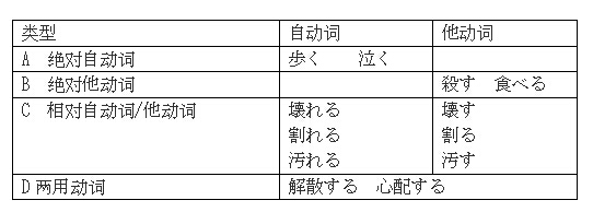 這樣一來,日語里的自他動詞可以分為四類:絕對自動詞(沒有對應的他動詞的自動詞)、絕對他動詞(沒有對應的自動詞的他動詞)、相對自動詞/他動詞(由共同的詞根派生出來的自動詞、他動詞)、兩用動詞(本身兼有自他兩種性質的動詞)。