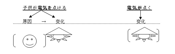 也就是說,“子供が電気を點ける(小孩打開了燈)” 既強調“開燈”的動作,也暗含了“燈亮了”這一變化。因此,“電気を點けた(打開了燈)”這句話同時含有“電気が點いた(燈亮了)”的結果。