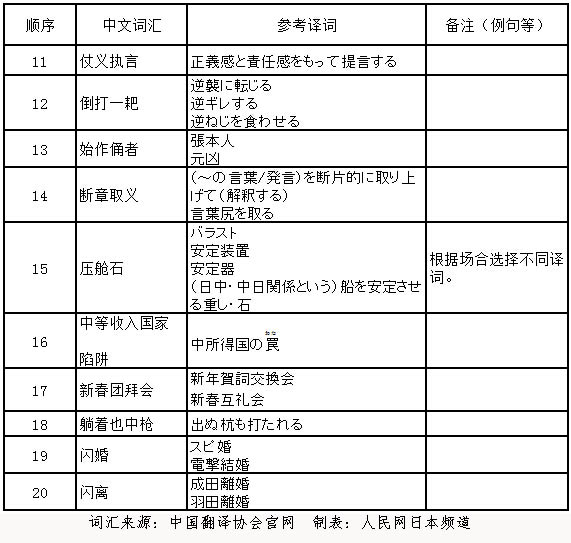 中國翻譯協會發布了2014年最新熱詞的日文譯法,這些詞匯包括“中國夢”、“躺槍”、“廣告植入”、“增信釋疑”、“炫”等等,涵蓋了政府公文、領導人講話、新聞報刊、網絡用語等各個領域。