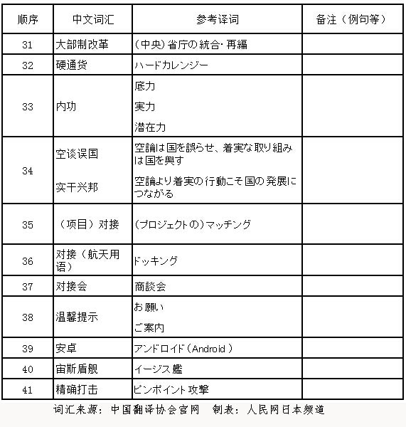中國翻譯協會發布了2014年最新熱詞的日文譯法,這些詞匯包括“中國夢”、“躺槍”、“廣告植入”、“增信釋疑”、“炫”等等,涵蓋了政府公文、領導人講話、新聞報刊、網絡用語等各個領域。