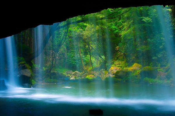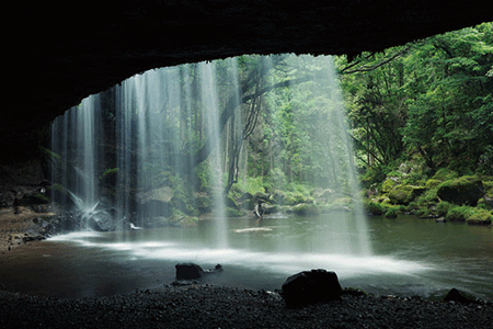 鍋瀑布位于南端的熊本縣阿蘇郡,這里最大的看點是瀑布水流的優雅與美麗。瀑布的里側有走廊,游客可以從背后看到纖細的水瀑,晴天之際,還能透過水流看到五色太陽光。