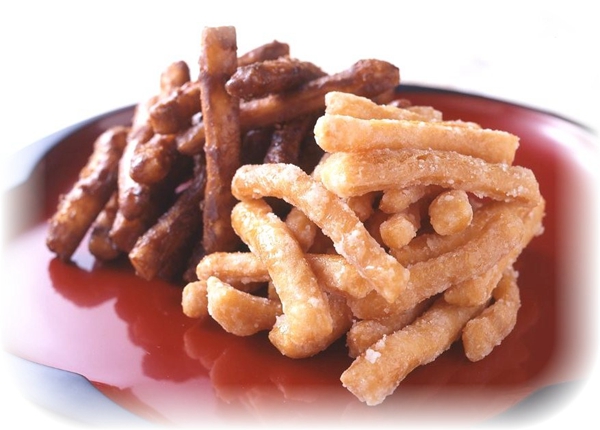 在面粉中加入雞蛋、砂糖和好后切成細長條用油炸,抹上黑糖稀的點心。