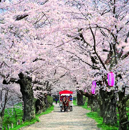 樹齡80年以上的“染井吉野”櫻延綿約2公里,形成了櫻花林陰道。還有復古的觀光馬車、北上川游覽船來來去去。晚上,櫻花林陰道還會點亮燈飾。