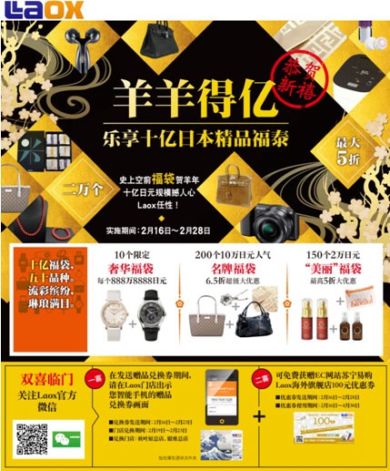 2月16日至2月28日,Laox將在羊年送出2萬個春節福袋。其中,最引人矚目的是10個2015年春節限定版奢華“福袋”,每個定價888萬8888日元。為了感謝外國游客對Laox長久的惠顧和厚愛,Laox愿意通過“福袋”為外國游客提供“愉快的夢想”,創造“訪日的快樂”。