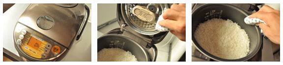 將盛好米的內膽放入電飯煲之前,盡量將內膽外側的水以及米粒等擦拭干凈,有助于延長電飯煲的使用壽命。