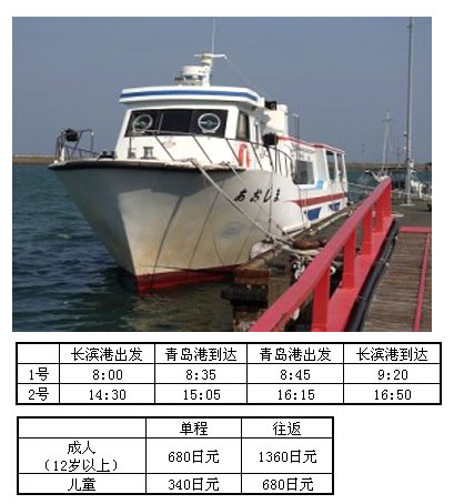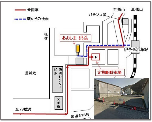 從愛媛縣松山市乘JR予讃線在伊予長濱車站下車(約70分鐘),步行約兩分鐘便可抵達長濱港。從長港乘輪渡“aoshima”(あおしま)號,約35分鐘到達青島港。