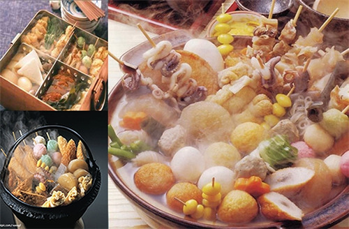 關東煮(おでん),做法是用干魚(かつおぶし)跟海帶熬成底料加上醬油調味,然后放進穿了竹簽的蘿卜豆腐貢丸等等長時間慢慢的煮,吃起來有種湯汁滲透的香味。因為大多是豆制品跟蔬菜,容易消化熱量又不高,是一種相當健康的小吃哦~