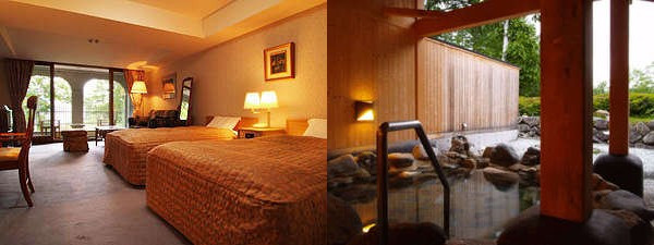 青木湖酒店度假村的洋式客房與露天溫泉(右)