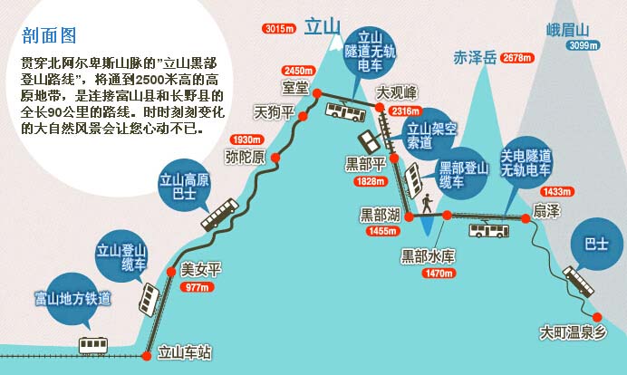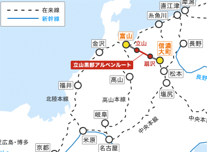 立山黑部阿爾卑斯路線,日語里稱“立山黒部アルペンルート:たてやまくろべアルペンルート”,是連通富山縣中新川郡立山町的立山站和長野縣大町市的扇澤站之間的一條通道,路線全長90公里,沿途行走在海拔2500米的高原,放眼望去盡是全日本堪稱絕景的壯麗山區景觀,沿途可以乘坐各式交通工具穿越在北阿爾卑斯山脈之間,讓旅者收獲震撼和感動,收獲在其他地方無法體驗到的感受,已成為一條馳名世界的國際化大型山區觀光經典路線。上圖:路線位置示意圖)
