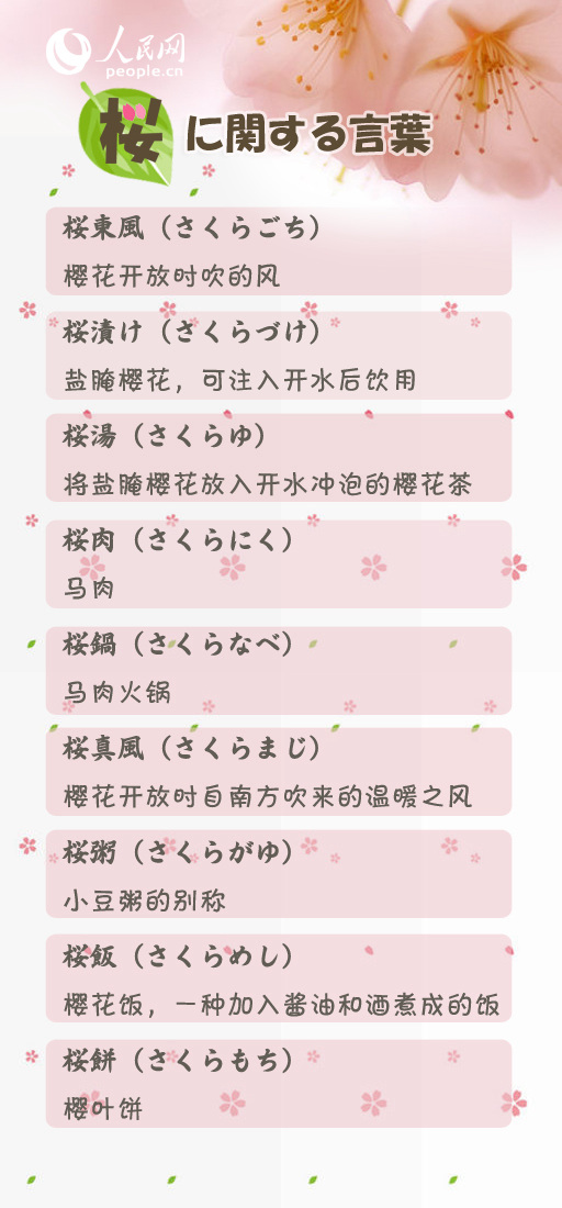 春季伊始,天氣回暖,又到了櫻花盛開的季節。日語中有許多和櫻花有關的詞語,其中有的是櫻花的別稱,有的是描寫櫻花姿態,還有一些借櫻花來表示粉紅色……賞花之余,一起來學習一下那些與櫻花有關的日語詞吧。