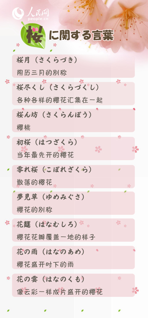春季伊始,天氣回暖,又到了櫻花盛開的季節。日語中有許多和櫻花有關的詞語,其中有的是櫻花的別稱,有的是描寫櫻花姿態,還有一些借櫻花來表示粉紅色……賞花之余,一起來學習一下那些與櫻花有關的日語詞吧。