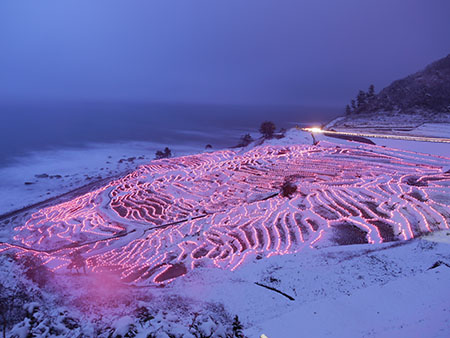 2001年,白米千枚田被指定為日本國家級名勝,約3萬個LED燈將田埂妝點得如夢如幻。>>>