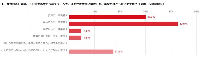 同樣,對于男性的汗水,沒有一位女性選擇“很有男人味,印象很好”。有二成以下的女性選擇“不介意”,有97%的男性選擇“不喜歡出汗”。 (編譯:袁蒙 審稿:陳建軍)