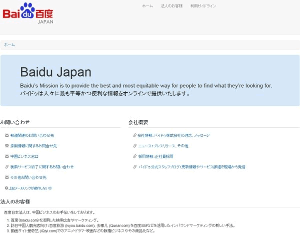 中國最大的搜索引擎百度公司日前證實,百度日本從3月起已經關閉了搜索引擎,退出日本搜索市場。今后,百度日本將主攻以日語輸入法APP“Simeji”為首的搜索以外的業務。