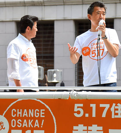 正在為大阪都構想拉票的橋下徹市長(右)和大阪府知事松井一郎(圖片來源:朝日新聞網站)