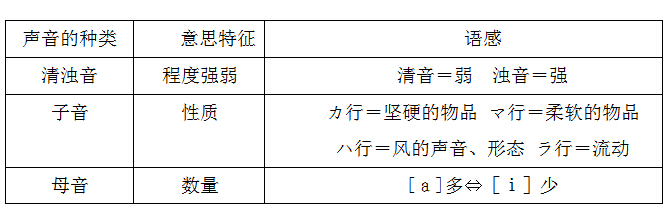 綜上所述,根據清濁音、子音、母音的不同,可以將擬聲擬態詞進行分類。這只是目前研究所得的結論,期待今后能有更多發現。