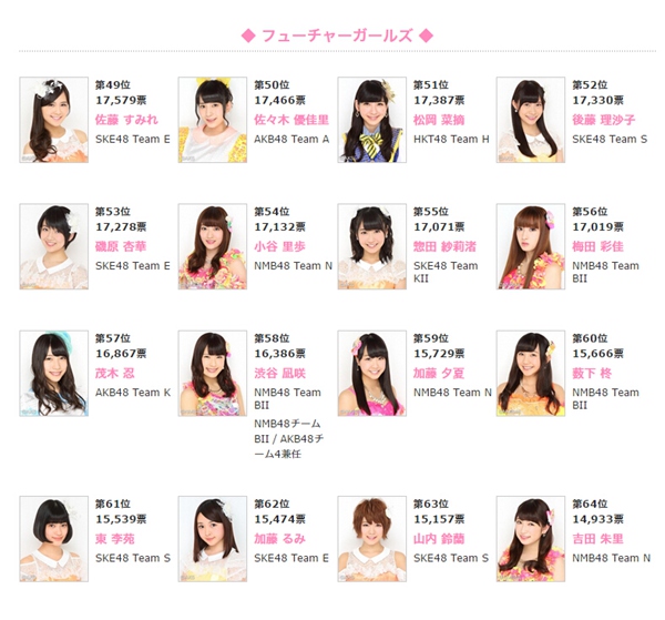 從進入前80名的組合分布來看,SKE48成員比去年增加4人,共有26人進入入選席位,成為AKB48團體中的“第一大黨”。HKT48則增加2名成員達到15人,NMB48同樣增加2人達到14人,而去年有31人入圍的AKB48成員在今年則降至23人。在16名選拔組成員中,AKB48也僅僅搶下6個席位,其姐妹組合的圍攻勢頭依然不減。(編譯:馬瀟漪 審稿:陳建軍)