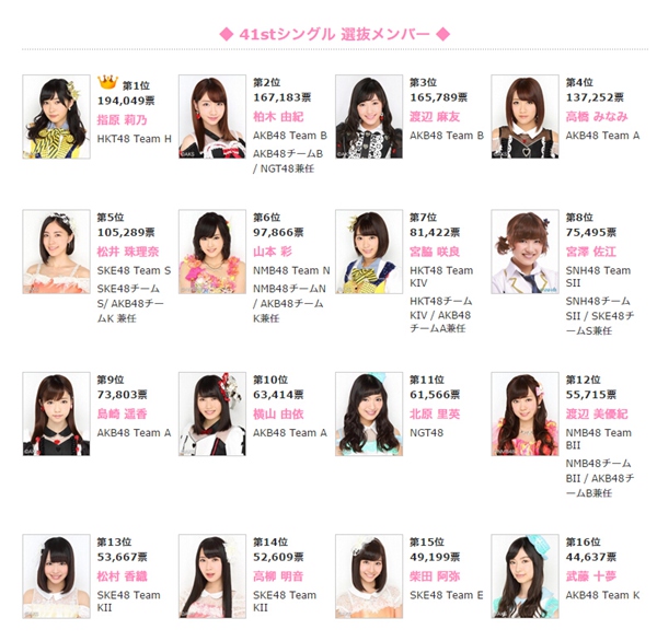 HKT48成員指原莉乃以創紀錄的19萬4049張選票時隔兩年重返女皇寶座。首次宣言要奪取冠軍的AKB48成員柏木由紀以大約2萬7000票的差距排在了第2位,AKB48成員渡邊麻友僅以微小的劣勢排在第3位。