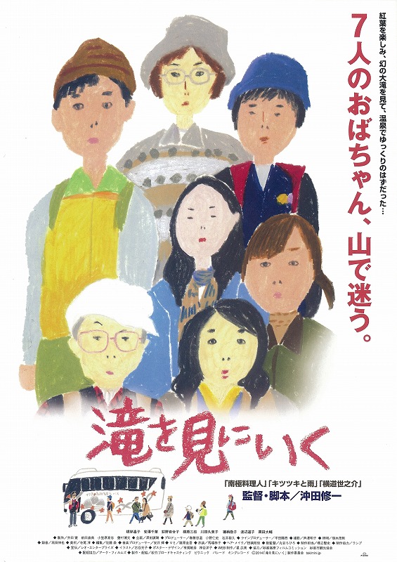 《去看瀑布》是日本導演沖田修一2014年作品,講述七個中老年婦女組成旅行團在導游失聯的情況下經歷了兩天一夜的旅程,一起去山區看到了美麗的瀑布。影片采用了業余演員演出,但在沖田修一的調教下的表現不亞于職業演員,而七個女人的性格特征也通過細膩的鋪陳表現出來。