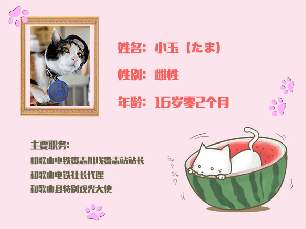 小玉是一只很可愛的雌性花貓,“她”的媽媽是一只流浪貓,被一名火車站清潔工撿到后送給日本鐵道貴志川線上的貴志站旁邊的小賣部主人喂養。由于持續虧損,運營貴志站的日本和歌山電力鐵路公司為減少人員開支于2006年4月將貴志站設置為無人車站,不再設專門的工作人員負責有關工作。為了吸引客流,和歌山電力鐵路公司想出了一個絕妙的創意:任命小玉為貴志站的“站長”。>>這只小貓也讓原本默默無聞的貴志站成為了聞名的旅游景點。