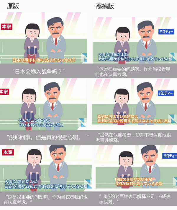 日本執政黨自民黨為了加強民眾對新安保法案的理解制作了宣傳視頻,結果卻遭到網友的惡搞,在網上引起很大反響。截止目前,惡搞版視頻的回放數達到31萬次,超過了原版。