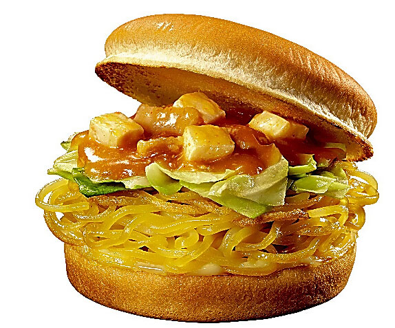 “蒙古湯面漢堡”是在面上澆上名店“蒙古湯面中本”特制的麻婆豆腐醬料,然后夾在面包之間;“蒙古飯漢堡”夾的則是米飯、生菜、特制麻婆豆腐醬以及沙拉醬。>>>>