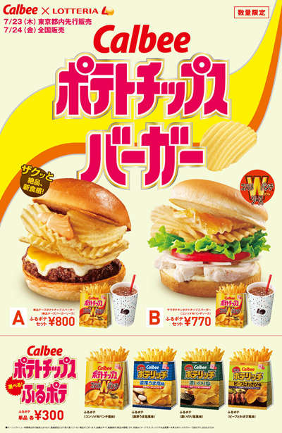 7月23日,樂天集團旗下連鎖快餐企業樂天利(Lotteria)與著名薯片品牌卡樂比(Calbee)合作,推出了“絕品芝士薯片漢堡”與“沙拉雞肉薯片漢堡”,將從23日起在東京率先發售,24日開始在日本全國發售。薯片漢堡融合牛肉、雞肉的柔軟和薯片的松脆,加上芝士、肉湯做成的特制醬汁,口感頗為獨特!敖^品芝士薯片漢堡”售價為420日元,“沙拉雞肉薯片漢堡”售價為390日元。
