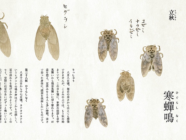 8月12日-17日。寒蟬(ひぐらし)是秋天蟬的一種,它的名字與“日暮し”(傍晚)的讀音一致,因其常在傍晚鳴叫而得名。日本人認為寒蟬“カナカナカナ”的叫聲十分悲涼,似乎在為消逝的夏天而感到惋惜。
