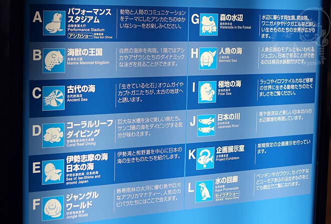 [E]伊勢志摩之海/日本海:以伊勢灣和熊野灘為中心,介紹了棲息在日本海中的海洋生物。還可以觀賞到在全世界首次繁殖成功的江豚。