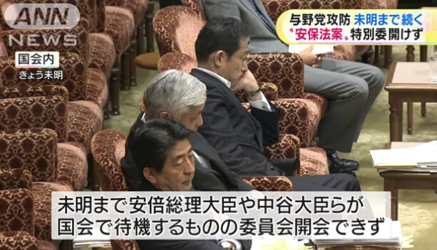 關于正在參議院特別委員會審議的安全保障相關法案(簡稱安保法案),日本執政黨原計劃于16日進行總結性質詢并表決,但由于在野黨議員的激烈反對,現場一片混亂,特別委員會理事會遲遲無法開會,而推遲至17日上午。
