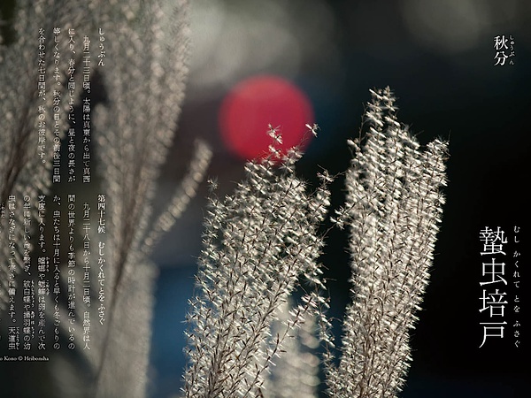9月28日-10月2日。蟄蟲壞戸與驚蟄節氣的第一候“蟄蟲啓戸”(すごもりむしとをひらく)相對,意思是由于天氣變冷,蟲子開始鉆到土里,并且用細土將洞口封起來以防寒氣侵入。