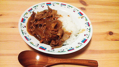 用豬肉和洋蔥、切碎的胡蘿卜做成的咖喱。一次做一大鍋然后分成小份冷凍,在有重要工作的當天早晨、或身體感覺疲勞的早晨我就會吃這個。為了不在解凍時破壞它的味道,咖喱里不放土豆是關鍵。