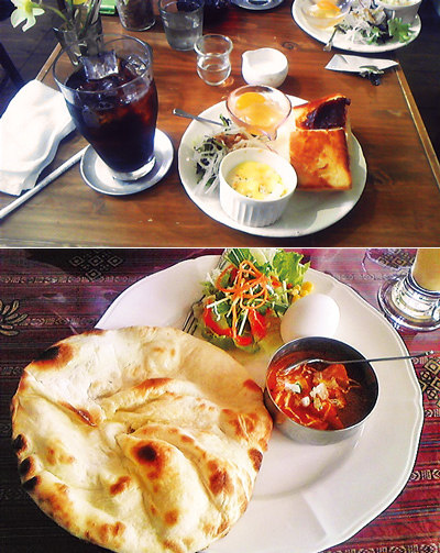 喫茶店が多い岐阜。午前中は飲み物代だけで、トーストと少量のサラダ、茶碗蒸し、小さなカットフルーツなどのモーニングサービスが付くのが當たり前です (左)。トーストは焼きたてですし、茶碗蒸しも熱いところが多い。私は月に1~2回食べます。カレー屋さんでは味噌汁のようなあっさりカレーと焼きたてナン(右)が、ロシア料理店ではピロシキが出てきました。価格は380~500円くらい(飲み物代)。プラス150~300円で、ミニパスタなどのオプションを付けたり、料理のグレードを上げたりできる店もあります。