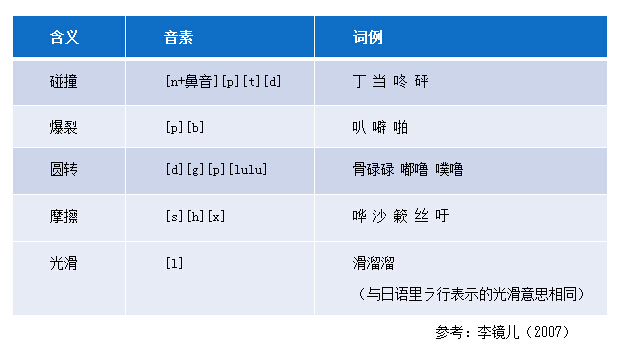 此外,中文擬聲擬態詞在表意上也有一些特征。例如,重疊詞一般表示聲音、動作的反復,或者用于聲響較大的場合;“n+鼻音”多表示物體與物體碰撞的聲音;“s”表示摩擦的狀態;“k”常用于形容硬度、光亮、尖銳的場合;而“l”則表示光滑,這與日語中“ら行”音節的含義色彩較為一致。與日語不同的是,日語里有很多可以表示事物柔軟(マ行)、堅硬(カ行)等不同靜態特征的輔音,而中文僅能表示兩種物體因接觸而產生的動態特征,例如“碰撞、爆裂、圓轉、摩擦”等。