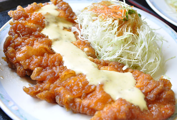 南蠻炸雞肉(チキン南蠻·チキンなんばん)的做法是,用油炸過的雞肉,再輕輕地用甜醋過一下,再澆上塔塔醬( tartar sauce),這種雞肉吃法也是發源于宮崎縣蜚聲全日本的一道名菜。