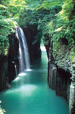 值得一看的是翻騰著白色飛沫、從高達17米斷崖飛瀉而下的真名井瀑布。峽谷沿途建有約600米的徒步游覽路,從春天到初夏山櫻花、杜鵑花、紫藤妝點岸壁,秋天紅楓盡染,一年四季可以觀賞不同景色。