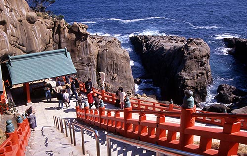 朱紅的正殿位于面朝大海的洞窟當中。參拜時,需要踩著沿著懸崖鋪好的石路往下走,是一處不多見的“下行宮”。