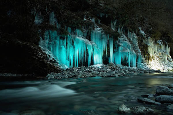巖清水結冰而成的自然藝術品,在“大瀧冰節”期間,燈光秀將冰柱照得如夢似幻。