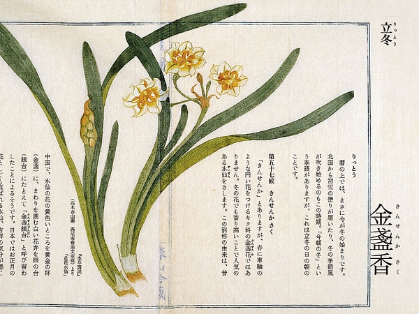11月17-21日。雖寫作“金盞”,但這里并不是指“金盞花”,而是“水仙花”(すいせん)。據說古代的中國將水仙花黃色的花心比作“黃金的酒杯”,將白色的花瓣比作“銀臺”,因此有了金盞的別稱。水仙在日本是非常有人氣的花,常在正月期間擺放,給人帶來吉祥喜慶的氣氛。(策劃/陳思)