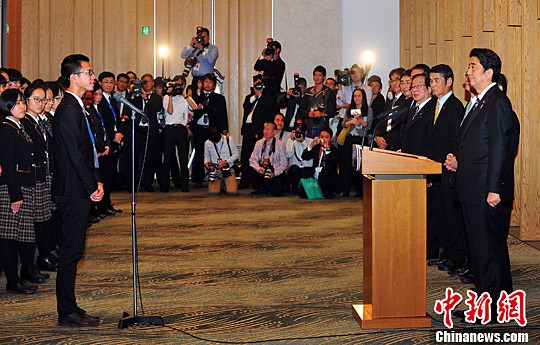 日本首相安倍晉三6日下午在首相官邸會見了應邀來訪的百名中國高中生。