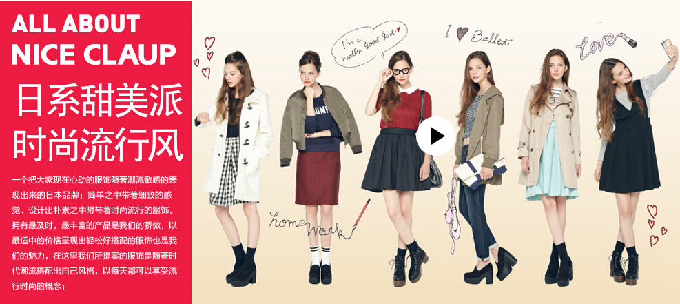 NICE CLAUP是日本上市公司的服裝品牌,在日本有超過110家零售點,同樣在亞洲地區也分布著百家零售店。NICE CLAUP以簡約,緊貼潮流,具有時尚觸角的設計而適合年輕上班族、追求日本風潮之年輕人。 尤其以各具特色的上衣、褲子、裙子和飾物結合為更富獨特自我的搭配而盡顯青春氣息及其風格。