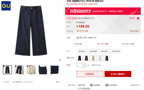優衣庫旗下品牌GU 8月24日正式入駐天貓。以“讓時尚更自由”為使命的GU,在日本以平價提供最新、最好玩的時尚,受到眾多年輕人追捧。相比于優衣庫,GU的定位更年輕、新潮、自由。GU在日本擁有315家店鋪,于2013年進入中國市場,相繼在上海開出兩家門店。雖然僅入駐不到3個月,但GU 同樣以積極姿態參與雙11大促,推出了多款特惠商品。