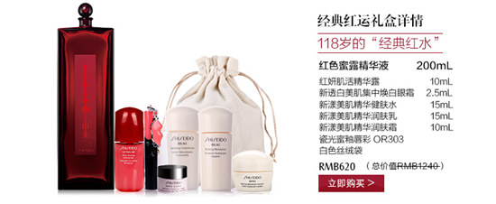 高保濕的紅水,溫和去除肌膚表現老化角質。打開肌膚水通道,提高肌底力的多功能精華化妝液。晶瑩剔透,性質柔滑,為你提供恒久妥善修護,逸發青春朝氣,F在購買經典紅運禮盒,內含紅色蜜露精華液200ml,此外還可獲贈紅妍肌活精華露10ml、新透白美肌集中煥白眼霜2.5ml、新漾美肌精華健膚水 15ml、新漾美肌精華潤膚乳15ml、新漾美肌精華潤膚霜10ml、瓷光蜜秞唇彩OR303及白色絲絨袋。