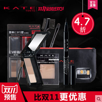 KATE持久亮眸套裝,內含造型三色眉粉、升級版暢妝持久眼線液、遮瑕防曬美肌粉餅及定制黑色化妝包。三件明星產品,只需218元,相當于4.6折。