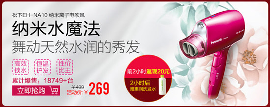 松下NA10納米專業護理吹風機,naonoe納米水離子含水量是負離子的1000倍,更加滋潤頭發頭皮;風嘴的設計能快速提升吹發速度,3分鐘快速干發,輕松打造各種造型;50°恒溫技術,快速換擋,健康護發,均勻散熱,干發同時令秀發健康亮澤。