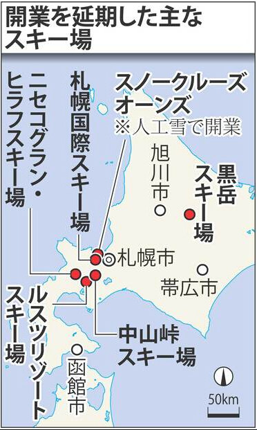 因粉末雪而在歐美游客中頗具人氣的二世古等后志地區也未形成大片積雪,原定于21日開放的二世古Grand Hirafu滑雪場和滑雪場營業時間都尚未確定。原定于13日開放的北海道道北地區黑岳滑雪場位于國立公園黑岳東北斜坡,為了保護植物,滑雪場開放的積雪厚度至少要達到1m。24日后,預計日本海一側將有大范圍降雪,該滑雪場負責人表示:“這次真是天降瑞雪,希望能多下一點,快的話估計能在24日對外開放!