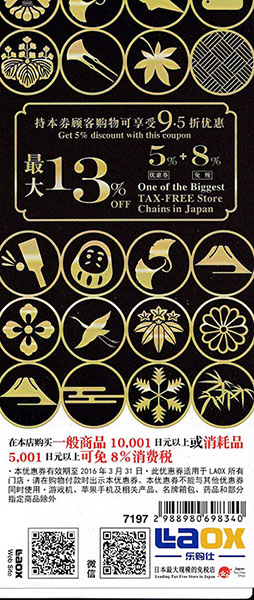 日本最大免稅店LaOX讓利13%,日本頻道讀者專享的優惠活動正式啟幕!獲取方式采用“到付”方式,也就是說需要折扣券的讀者需要先告知郵寄地址和負擔快遞郵費。