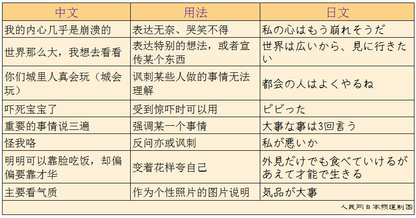 “主要看氣質”、“嚇死寶寶了”、“重要的事情說三遍”、“我的內心幾乎是崩潰的”……2015年就要過去了,今年的網絡流行語你會幾句?想讓日本人了解這些句子的話,該如何解釋呢?一起來學習一下2015年網絡流行語的日語說法。(制表/陳思)