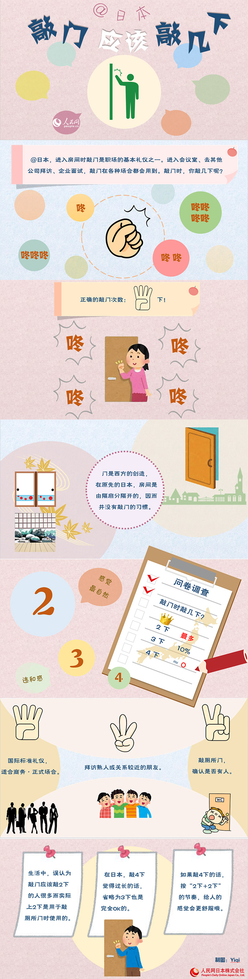 在日本,進入房間時敲門是職場的基本禮儀之一。進入會議室、去其他公司拜訪、企業面試,敲門在各種場合都會用到。敲門時,你敲幾下呢?