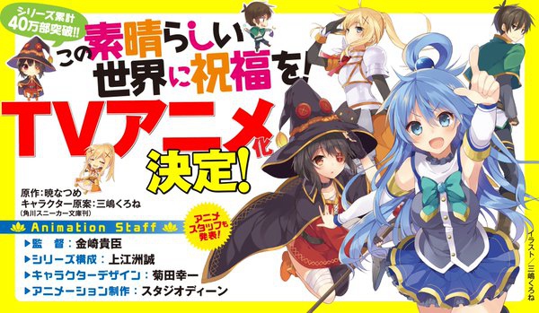 電視動畫《為美好的世界獻上祝福!》改編自暁なつめ原作的同名輕小說。男主角佐藤和真的人生遭遇交通事故,當他醒來之時,眼前出現了一位自稱是女神的美少女……